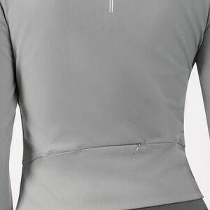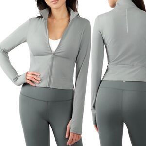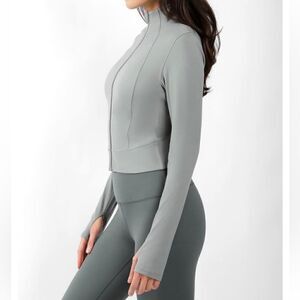 Thumbhole Cuff Stretch Jacket. Stretchy jacket with stand collar and thumbhole cuffs. Front zip closure. Hidden zip pocket in back. Color is a light sage green. Still in cellophane packing. Model is wearing size S and stats are 5’10” height, 34” bust, 27” waist, 35” hips