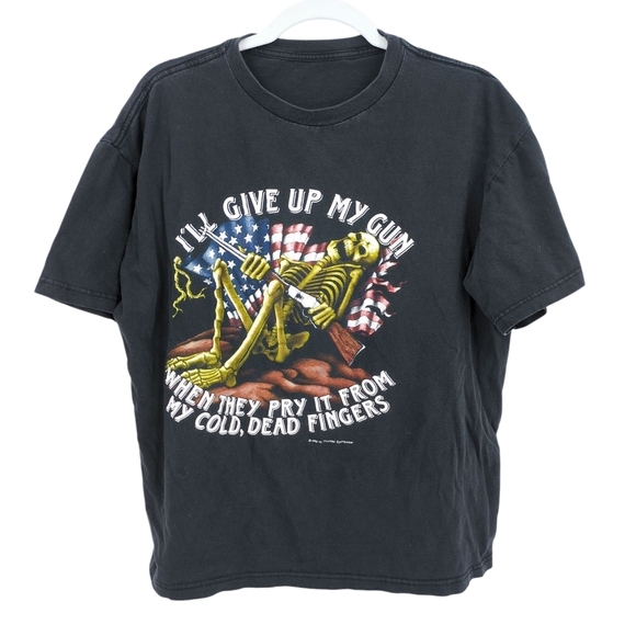 Thunder Sportswear Gun Cold Dead Hands 2nd Amendment USA Patriotic America T Shirt Men's Medium. Fair used condition, some wash wear throughout and the graphic is slightly off center. No size or fabric tag, *size estimated based on measurements below. Shirt says: I'll give up my gun when they pry it from my cold, dead fingers. Feels like a cotton poly blend. Soft!