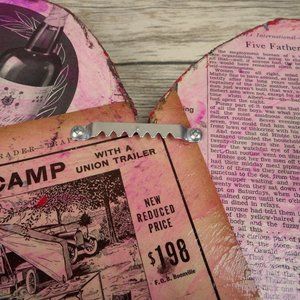 -Mixed media, one of a kind piece, made of found objects, paint, wood, grout, and sealant