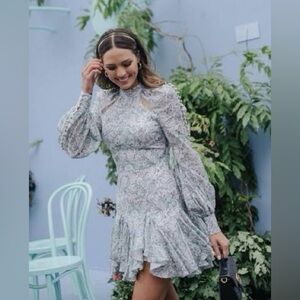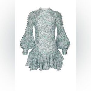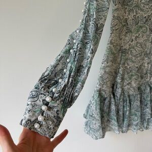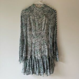 Thurley Dahlia Green Paisley Swirl Ruffle Dress SZ 0 buttons details mock neck