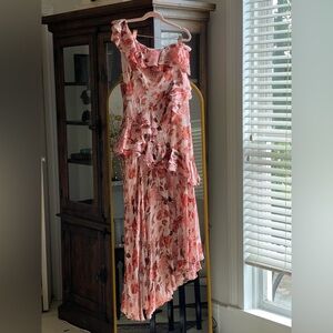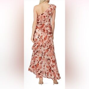 Pink floral printed silk (100% Silk). Gown. Sleeveless. One shoulder neckline. Hidden side zipper closure. Partially lined. See size and fit tab for length. Imported.