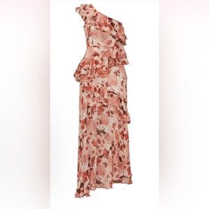 Tiered asymmetric ruffles flutter and cascade down this elegant floral maxi gown from Thurley, making it an ethereal choice for your next formal affair.