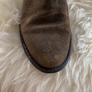 Super cute suede pull-on Chelsea boots from Thursday Boot Company. Dark olive/brown color. I believe they are the Duchess style.