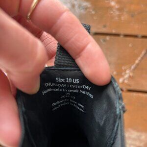 These boots are absolutely stunning and I'm so sad they're too small for me. I bought these (Size 10) and a Size 10.5, and decided to keep the Size 10. I wore them once for about 5 hours, and realized the Size 10 is too small for me. There is zero damage to the boots, but due to the creases from the small amount of wear, I cannot return them to Thursday Boot Company. These gorgeous black leather boots are in need of their forever home.
