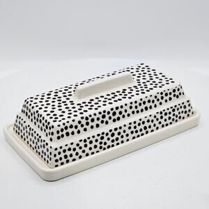 Thyme & Table Ceramic Butter Dish Black Dot Contemporary Stoneware Covered Lid. No chips or cracks. Excellent condition! A butter dish that’s as chic as your kitchen. Keep your butter fresh and stylish with this Thyme & Table ceramic butter dish. Featuring a sleek black dot pattern and durable stoneware construction, it’s designed for modern kitchens. The covered lid ensures freshness, while its dishwasher and microwave-safe design makes cleaning effortless. Perfectly sized for standard butter sticks, this contemporary dish adds a touch of sophistication to your table.