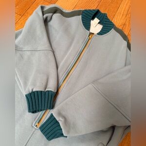 Oh so cute! Light blue Fleece one piece sweat suit. Baggy flight suit fit. Multi color zipper. Side pockets and ribbon detail. Knit collar and cuffs.