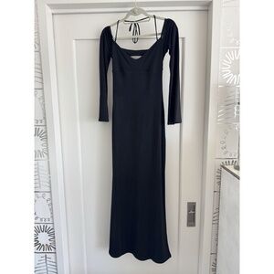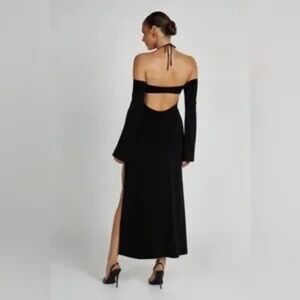 Brand: Meshki Color: Black Size: Large (L) Condition: NWT brand new (never worn) Slinky off shoulder maxi dress with a back cutout, held up by a tie at the neckline. Fit is relaxed but stretchy. 95% polyester / 5% elastane
