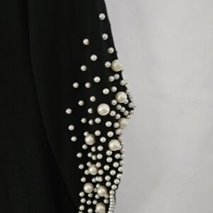 Elegant black asymmetrical dress. Features pearl accents on sleeves. Perfect for evening wear.