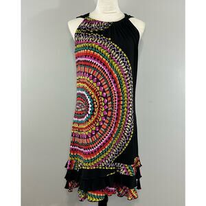Tiana B Black Colorful Mosaic Sunset Print Ruffle Hem Sleeveless Dress Sz S