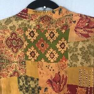 Item: Womens button-front shirt/tunic in a multicolor patchwork floral print with autumnal tones.