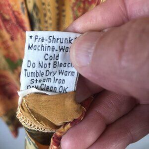 Details: V-neck with mini stand collar, long sleeves, lightweight drapey fabric, shell-style buttons, side vents at hem, boho artsy pattern, pre-shrunk care tag instructions noted.