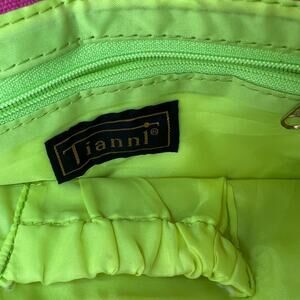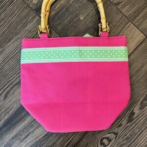 Pink Tiannl handbag with green bow. Beautiful wood handles. 1 small mark. See pictures for imperfections. In good used condition.