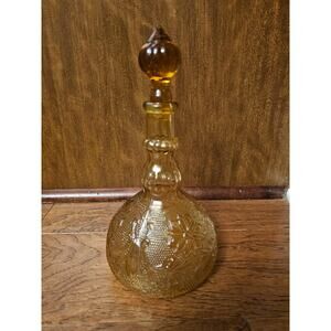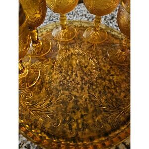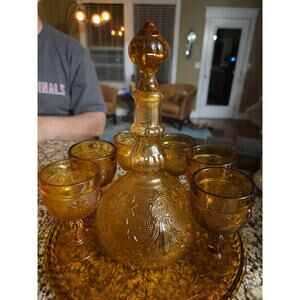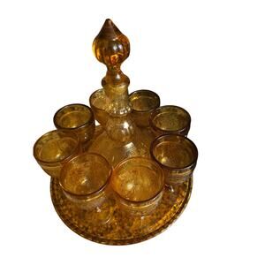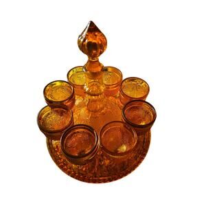 Elevate your home bar with this exquisite vintage Tiara Amber Indiana Sandwich Glass Decanter set! This stunning set includes a beautiful Amber Genie Bottle/Decanter, Amber Serving Tray and 8 matching Glasses, all in excellent condition. The rich amber color and intricate Sandwich Glass pattern make this set a true statement piece, perfect for entertaining or displaying as a cherished collectible.