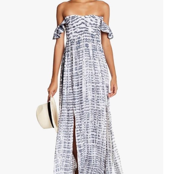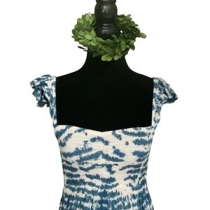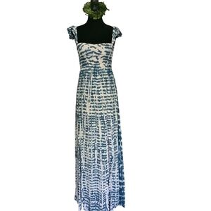 Tiara Hawaii Hollie off shoulder or strapless blue a white tie dye maxi dress. One size (best fits small-medium). Ruched elastic top. Babydoll fit.