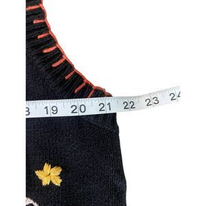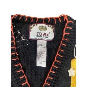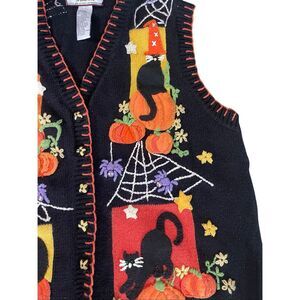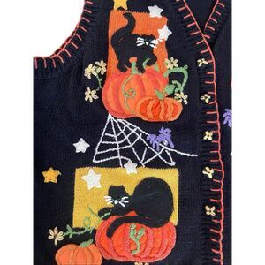 Festive vintage-style sweater vest by Tiara International, perfect for Halloween or fall events. Features colorful embroidered black cats, pumpkins, cobwebs, stars, and flowers on a black knit base with orange whipstitch trim. The whimsical details make it a standout piece for parties, trick-or-treating, or seasonal layering.
