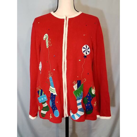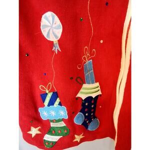 Tiara International; Red Christmas vintage sweater with Christmas stockings full of presents.