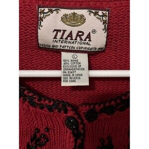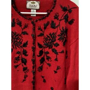 Tiara Red Sweater Cardigan Front Button Embroidered Beaded Christmas Sz L