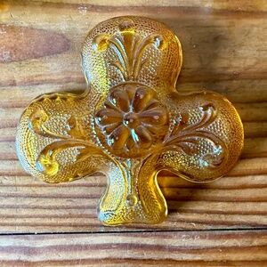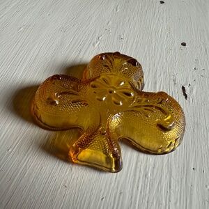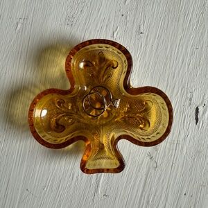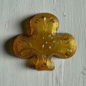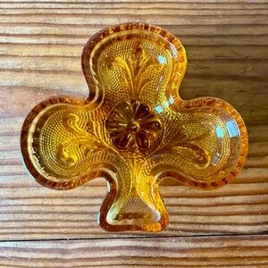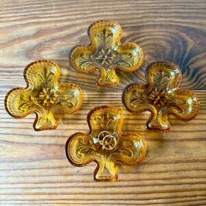 A charming set of four clover-shaped amber glass ashtrays from the Tiara Sandwich Collection. Each piece features intricate pressed floral and scrollwork designs, adding warmth and detail to any tabletop. Originally designed as ashtrays, these versatile little dishes are perfect as ring trays, condiment bowls, or trinket catchalls.