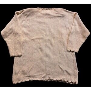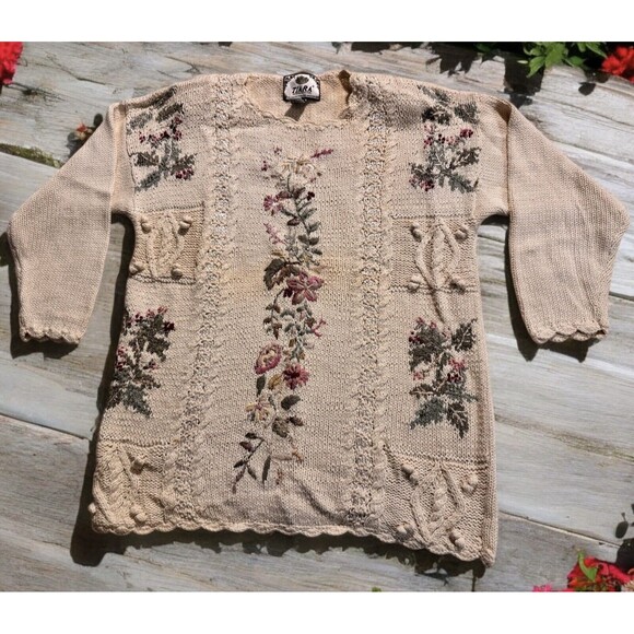 This is a vintage Tiara International pullover sweater in size M. It features floral embroidery and is made from a blend of ramie and cotton. The sweater has long sleeves and a cream color.