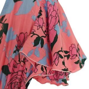 Tiare Hawaii New Moon maxi dress in women's size small/medium. Secret Garden Pink floral. V-neckline. Short flutter sleeves. Smocked waist has drawstring ties. Natural buttons down the front. Front slit. Open back. Gently pre-owned.