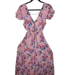 This Tiare Hawaii sundress is a perfect choice for wedding guests, featuring a pink floral pattern with a high-low hemline. The sleeveless design with spaghetti straps and a fitted bodice offers a flattering silhouette, while the airy fabric ensures comfort and elegance. Ideal for warm weather occasions, this dress combines style and grace effortlessly. "Brand new, never used, but without tags."