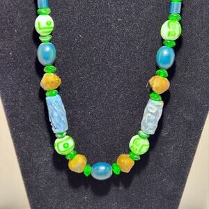 Featuring a delightful combination of green and blue beads, this necklace is sure to catch the eye and complement any outfit. The glass and terracotta clay beads add a touch of earthy elegance, making it a versatile piece for both casual and dressy occasions.