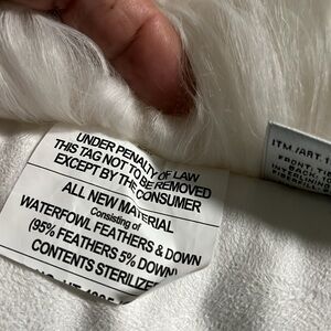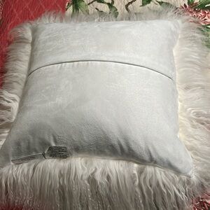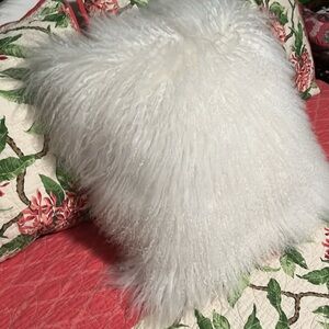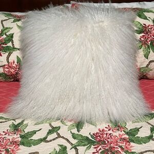 Beautiful and very gently loved. No pets or smoking in my home. Displayed in my guest room untouched! Size is 18” x 18” and has a soft poly-suede like back that zips open to remove the insert pillow. In beautiful condition with no discoloration or damage whatsoever. Color is Ivory. So unique with the longer lamb hair.