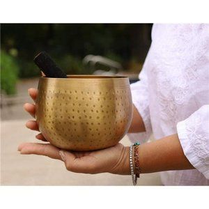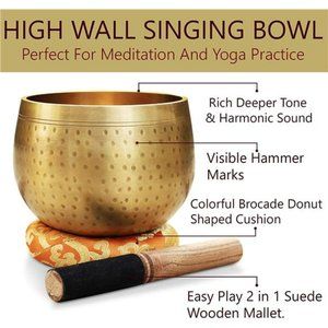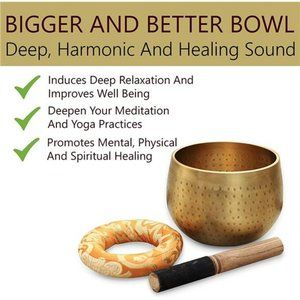 🧿TIBETAN PRO MEDITATION SINGING BOWL SET- High-quality 5.5” Diameter X 4.5 High Wall And Weighs 1250 Grams (2.12 Lb) Meditation Grade Singing Bowl Set is made using traditional techniques of crafting and hand hammer mark on the bowl is hand crafted by devoted artisans in Nepal. The set includes a dual face wooden suede mallet and hand-sewn donut cushion. (Donut Cushion & Mallet Color May Differ)