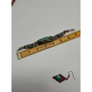 Tibetan Turquoise Coral Jewelry Set • Necklace Bracelet Earrings • Boho Artisan