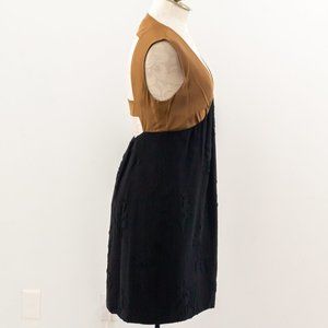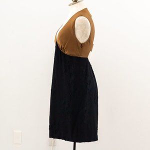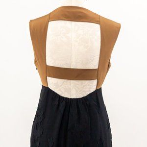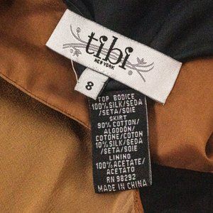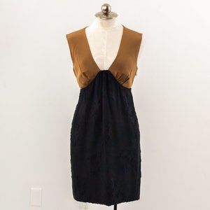 Tibi 8 Silk Colorblocked Black & Brown Mini Sheath Dress. Sleek short sleeveless plunge neck. Lightweight silk perf for spring/summer. Fully lined. Gathered at waist. Beautiful subtle tonal floral woven in black fabric. Open keyhole back / cutout.
