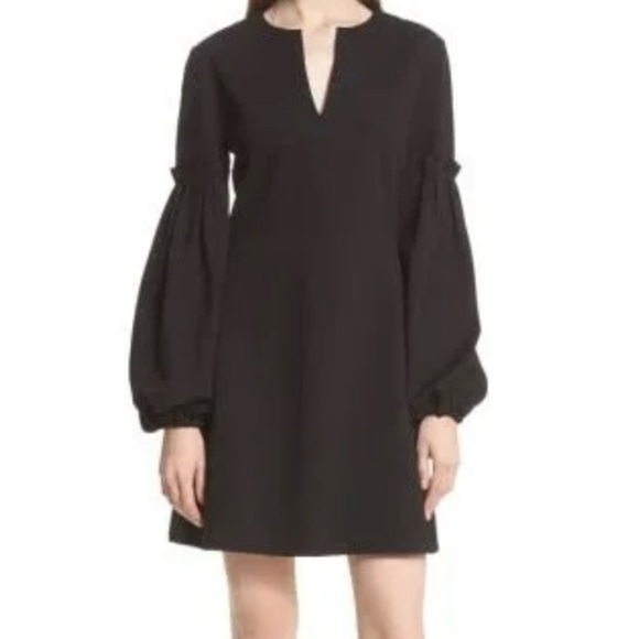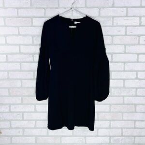 Chic black dress with long bishop sleeves. Features a stylish V-neckline and fit and flare silhouette Perfect for versatile wear.