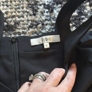 This chic black sheath dress by Tibi is perfect for a cocktail night out, featuring stylish 3/4 bell sleeves and a modern cold shoulder square neckline. Its sleek silhouette offers a sophisticated look, making it a standout piece for any evening occasion.