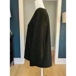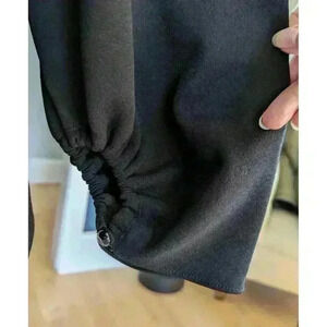 This Tibi top is a classic wardrobe essential with a relaxed fit. The black color and solid pattern make it versatile for any occasion. The V-neckline and 3/4 balloon sleeves add a touch of femininity, while the shirred sleeves give it a unique look.