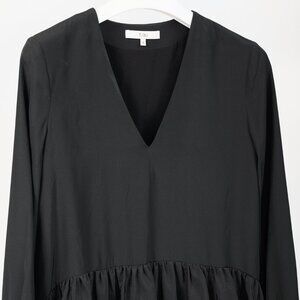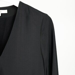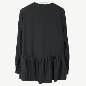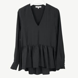 This blouse from Tibi circa 2018 is crafted in a Black silk crepe, and features long sleeves, buttoned cuffs, a V-shaped neckline, a ruffly peplum hem for a flattering feminine finish, and is lined in a tonal rayon.