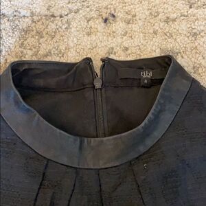 Black textured Tibi top with leather trim at collar. Would benefit from a trip to the dry cleaner - priced accordingly. Looks great tucked into a skirt or with pants! Great to wear to work, put under a blazer, wear on a date - the ultimate top!
