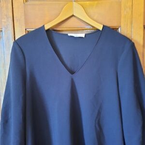 Tibi Black V-neck 3/4 Length Sleeve Popover Blouse Size Small. Popover style blouse with v-neckline, 3/4 length sleeves, loose flowy fit, fully lined, and a slightly round hi-lo hemline. In excellent condition! Medium weight wrinkle resistant material 94% polyester 6% elastane. Size small.