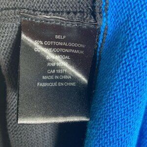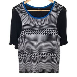 Modern and chic, this Tibi sweater dress features a striking black-and-white geometric knit pattern with bold blue colorblock accents. The short sleeves and lightweight construction make it ideal for layering or wearing on its own in transitional weather. Perfect for work, casual days out, or styled with boots for a mod-inspired fall look. Excellent preowned condition—see photos for details.