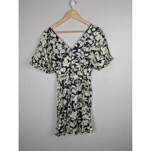 Chic mini dress by Tibi. Features a black and cream floral pattern. V-neckline with short sleeves. Perfect for casual outings.