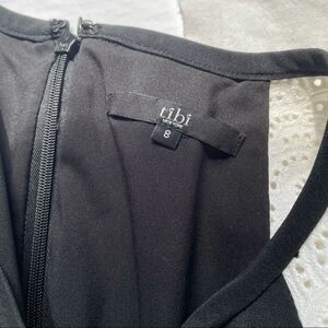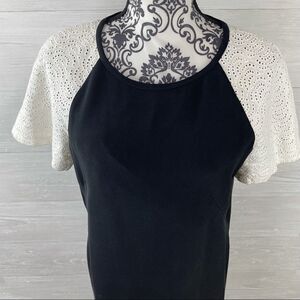 Tibi Carey eyelet dress size 8. Black silk/linen blend material with white white eyelet short sleeves. Shift silhouette with crewneck collar. Lined with discreet back zipper. No holes or stains, one divot at end of zipper that can’t be seen when worn. Beautiful dress!