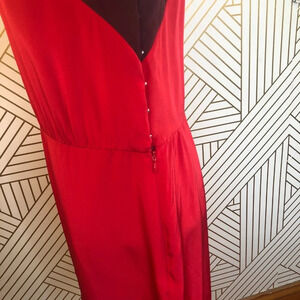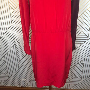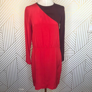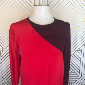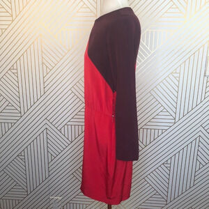 Tibi Colorblock Silk Dress in Red and Burgundy. Crew neck. Long sleeves. Side zip closure and hook and eye closure. Elasticized waist. Colorblock detailing. Keyhole at back.