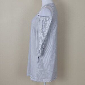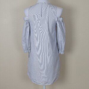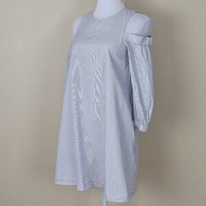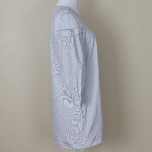 Tibi stripe cold shoulder shirt dress. Size 0. Navy and white stripe. Back keyhole opening. Long sleeve. Side seam pockets.