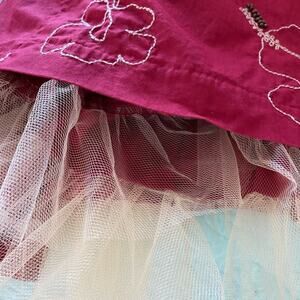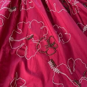 Tibi dress size 8. Small stain see photos. strapless dress with cream floral embroidery, tiny brown wood-like beading and ruffled tulle hem. Padded bra cups. Side zipper.