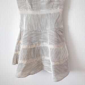 titty women's dress size 6. sleeveless fit and flare textured cream and gray lines cotton polyester with silk lining high neck ruffle bottom skirts measurements length 35 flat across underarm 17 in gently pre-owned condition. high quality designer dress!