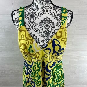 Tibi Fit & Flare dress size 12. Multicolor swirl print silk shell with acetate lining. Tank straps and v-neck collar. Discreet side zipper closure. Lightweight. No holes, 1 small pen mark and small mark that can’t be seen when worn.