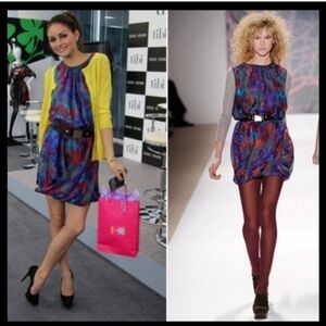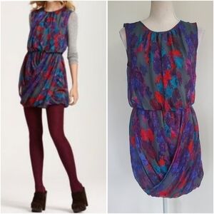 Tibi Genevieve watercolor silk pullover dress with back keyhole button closure and draped skirt.