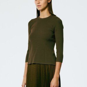 Elevate your wardrobe with the Tibi Giselle Stretch Sweater, a versatile piece in a chic wood color. This pullover features a sculptural ribbed knit design, combining both fashion-forward elements and practicality. A standout circle cut-out at the back adds a modern twist, making it perfect for layering or wearing as a statement piece. Ideal for year-round styling, it can be paired with a variety of bottoms, from skirts to joggers. The top is pre-owned, yet in excellent condition, ready for your next outing.
