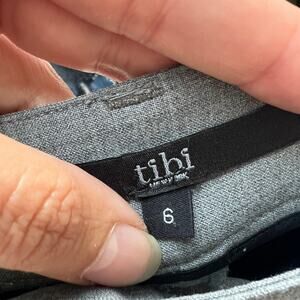 Tibi tailored gray trousers featuring a slim, modern silhouette, perfect for workwear or polished everyday styling. Designed with side pockets, back welt details, and a flat front closure. Front leg slit for a sleek, elongating fit. Size 6 - 16.5" waist; 10" rise; 29" inseam.