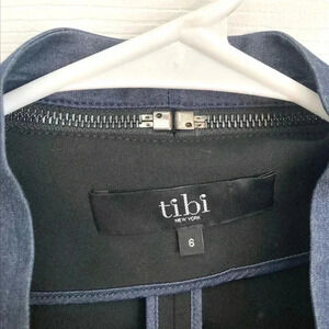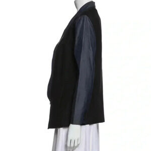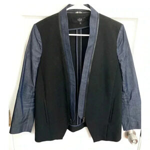 Gorgeous open blazer style jacket with black body and faux jean sleeves. Careful zipper detail that goes around the collar and down the front. This zipper isn’t functional, it’s purely decorative. The sleeves have three buttons. The front of the lapels come to a point. Bulleting on the back for a more fitted look. This is a real statement piece! Retails for $730. Measurements pictured. The front pockets don’t appear to be functional.