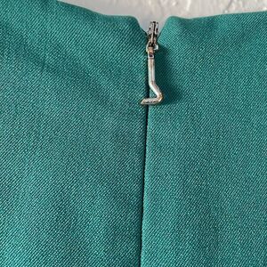 Green crepe (63% Polyester, 33% Viscose, 4% Elastane). Hourglass. Long puffed sleeves. Crew neckline. Hidden back zipper with hook-and-eye closure. Fully lined. 34" from shoulder to hemline. Imported.