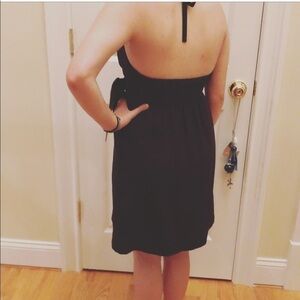 Adjustable Neck Strap, ruffle detail, wrap button closure, around 35” long depending on adjustable neck strap, 100 % silk, little black dress, cocktail dress. Open back, Ties on side.